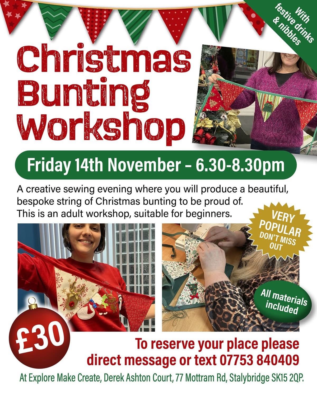 Join us for an evening of creative sewing and leave with some beautiful and unique bunting to decorate your home this Christmas. This is suitable for all skill levels, from absolute beginners to those with more experience who just want to sew in company. There will be mulled wine and mince pies too! And we'd love it if you came in your Christmas jumper!
